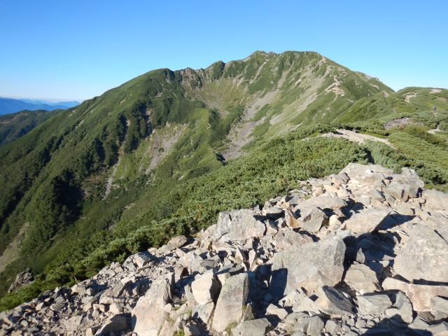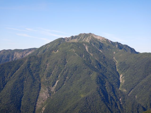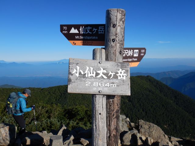 翌日は仙丈ヶ岳に向けて5時出発。本日も快晴。大滝の頭から急登が始まる。樹林帯を抜けると右には昨日登った甲斐駒ヶ岳が左には仙丈ヶ岳のカールが見えてくる。感無量。小仙丈ヶ岳を経て仙丈ヶ岳頂上。今日も最高 満足でした。