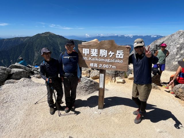 翌日、6時甲斐駒ヶ岳に向けて出発。仙水小屋を経て仙水峠から急登が始まる。急登をあえぎながら登り、後ろを振り向くと鳳凰三山とその背後に鎮座する富士山がくっきり見える。北岳が見える。明日登る仙丈ヶ岳が見える。言葉が出ない。駒津峰を経て岩場の急登を登り甲斐駒ヶ岳頂上。最高 満足。