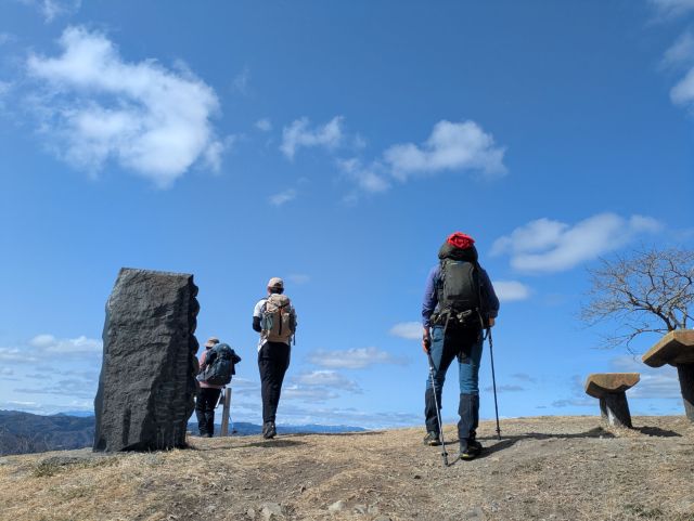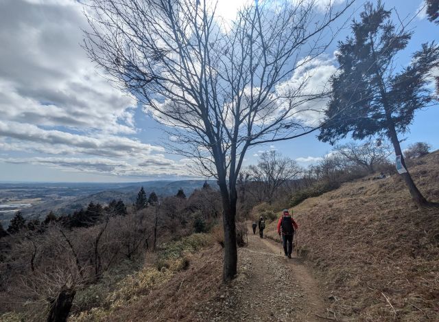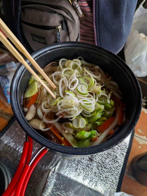 春の陽気の中をのんびり歩いて約40分ほどでで山頂に到着しました。天気に恵まれ、西には蔵王連峰、東にはきらめく海岸線が広がり、低山ながら見入ってしまう展望でした。行程が短い分、今回のお楽しみイベントとして山飯クッキングを開催。山頂近くの東屋でうどんを作って皆で楽しみました。景色を眺めながら外で食べる温かい一杯はやはり格別です!