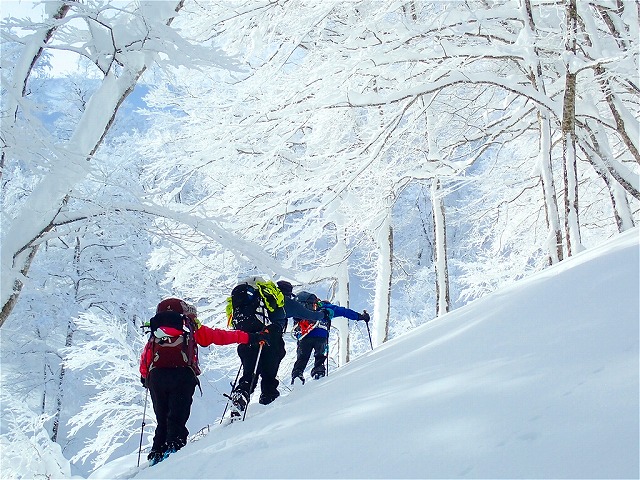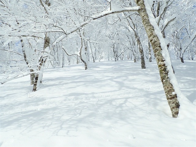 ここは標高が低いため時期を選びますが、今回は期待通りのパウダースノーに恵まれ、ブナ原生林の中、極上のツリーランを楽しみました。