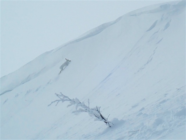 山頂付近では、テンに追われるノウサギの姿も。こうした野生動物との出会いも、バックカントリーの魅力です。
