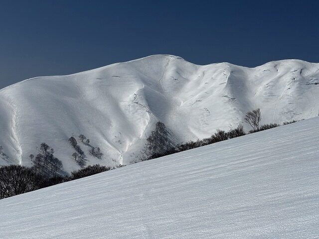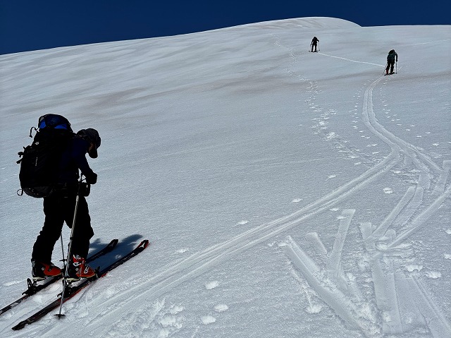 姥ヶ岳山頂は無風。360度の展望を満喫しながら、まったり食事をした後、大斜面に滑り込む。気持ちのいいザラメで超快適、もちろん登り返す。