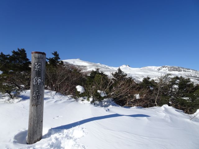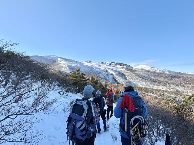 快晴の山頂を後に、登ってきた道を下って行く。帰り際にも山頂方面の景色が見えていて名残惜しい。ゆっくりペースで冬の安達太良山を楽しめた。