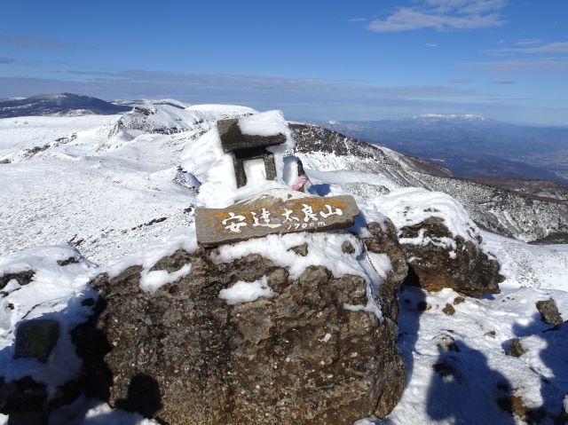 11人のメンバーで安達太良山へ。あだたらスキー場脇の道から歩き始める。途中からワカンを装着し五葉松平の急登へ、薬師岳からアイゼンに履き替え山頂を目指す。